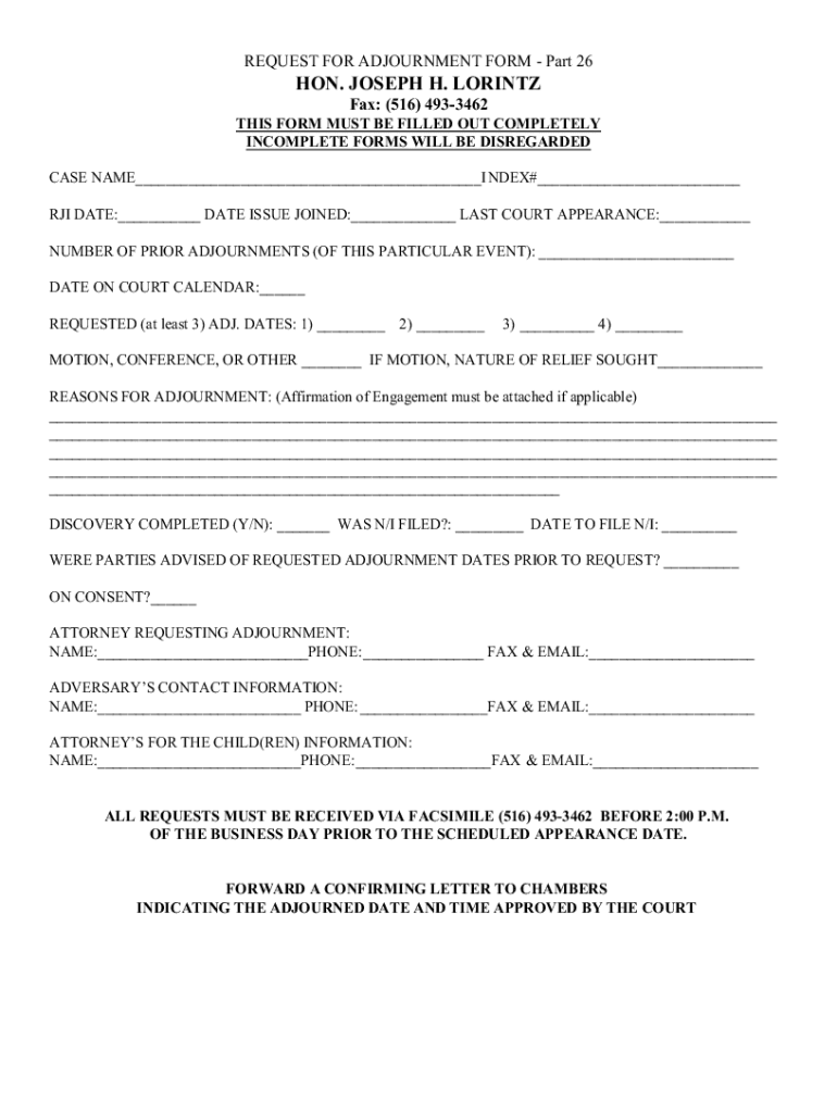 REQUEST FOR ADJOURNMENT FORM Part 26HON. JOSEPH H. LORENTZ Fax: (516) 4933462 THIS FORM MUST BE FILLED OUT COMPLETELY INCOMPLETE FORMS WILL BE DISREGARDED CASE NAME I INDEX# RJ DATE: DATE ISSUE JOINED: