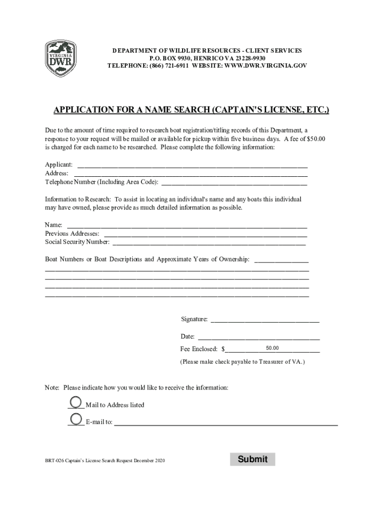 DEPARTMENT OF WILDLIFE RESOURCES CLIENT SERVICES P.O. BOX 9930, ENRICO VA 232289930 TELEPHONE: (866) 7216911 WEBSITE: WWW.DR.VIRGINIA.APPLICATION FOR A NAME SEARCH (CAPTAIN IS LICENSE, ETC.) Due to
