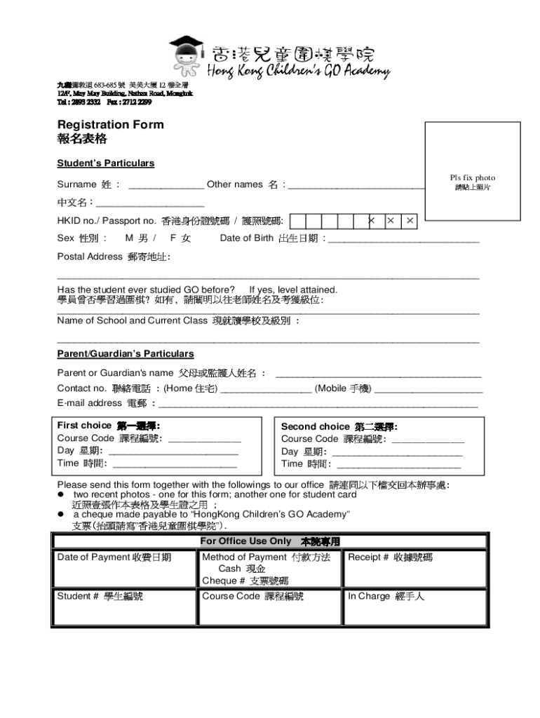 683685 12 12/F, May Building, Building, Nathan Road, Bangkok Tel : 2893 2332 Fax : 2712 2299 Registration Form Students Particulars Surname: Other names : Pls fix photo HID no./ Passport no. / : Sex