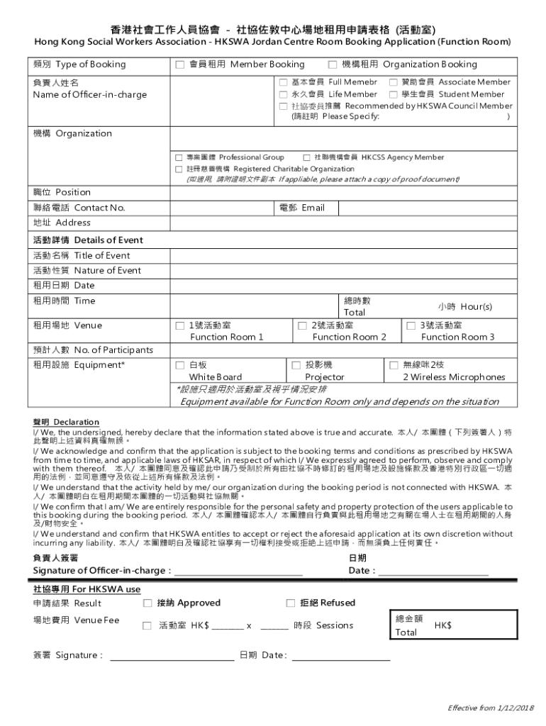 ()Hong Kong Social Workers Association HSA Jordan Center Room Booking Application (Function Room) Type of Booking Member Booking Name of Officerincharge Organization Booking Full Member Associate
