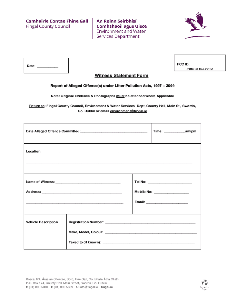 FCC ID:Date: (Official Use Only)Witness Statement Form Report of Alleged Offense(s) under Litter Pollution Acts, 1997 2009 Note: Original Evidence & Photographs must be attached where Applicable Return