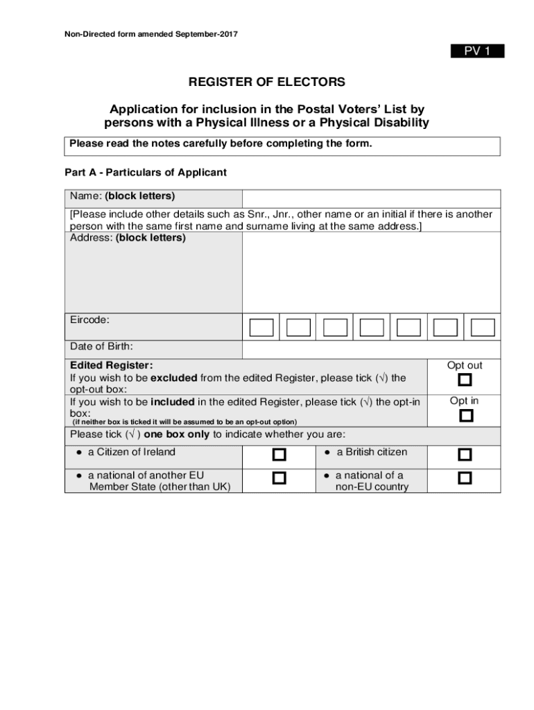 Co-directed form amended September2017PV 1 REGISTER OF ELECTORS Application for inclusion in the Postal Voters List by persons with a Physical Illness or a Physical Disability Please read the notes