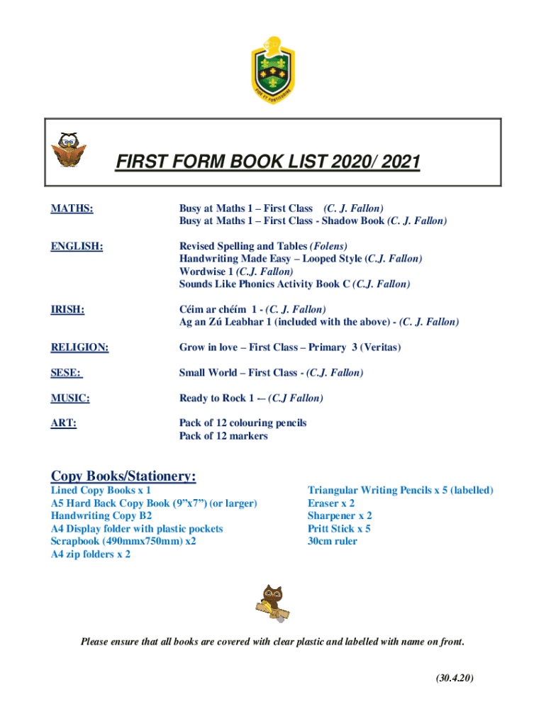FIRST FORM BOOK LIST 2020/ 2021 Math:Busy at Math 1 First Class (C. J. Fallon) Busy at Math 1 First Class Shadow Book (C. J. Fallon)ENGLISH:Revised Spelling and Tables (Fol ens) Handwriting Made Easy