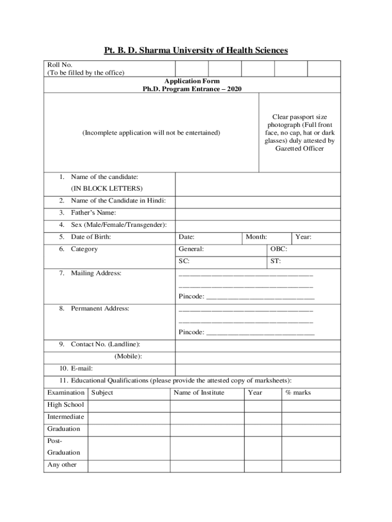 Pt. B. D. Sharma University of Health Sciences Roll No. (To be filled by the office) Application Form Ph.D. Program Entrance 2020Clear passport size photograph (Full front face, no cap, hat or dark