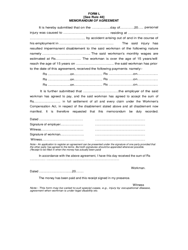 FORM L See Rule 48 MEMORANDUM OF AGREEMENT It is hereby submitted that on the .day of20. Personal injury was caused to residing at. ...... by accident arising out of and in the course of his employment