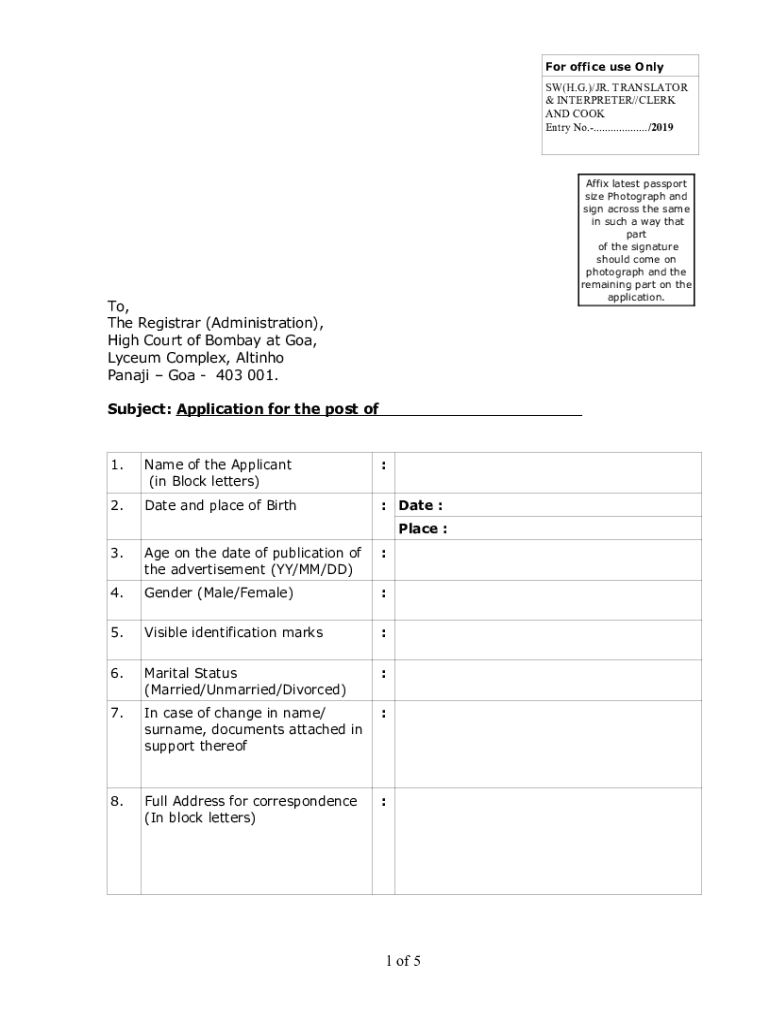 For office use Only SW(H.G.)/JR. TRANSLATOR & INTERPRETER//CLERK AND COOK Entry No..................../2019Affix the latest passport size Photograph and sign across the same in such a way that part