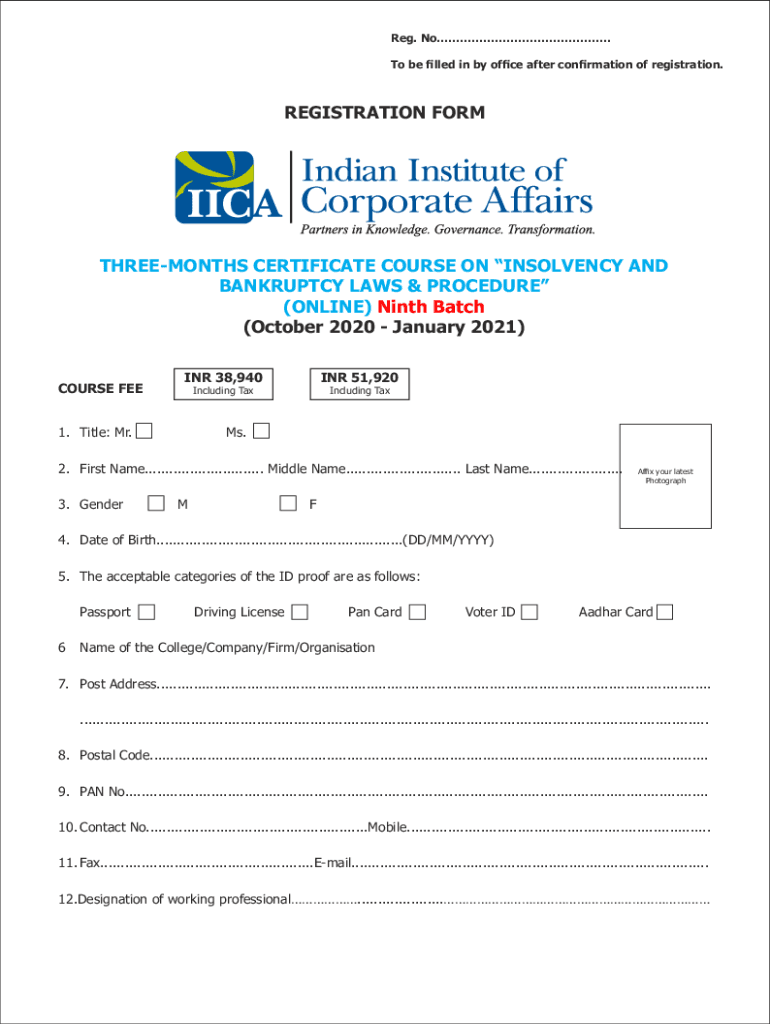 Reg. Now To be led in by OFCE after formation of registration. REGISTRATION FORMTHREEMONTHS CERTIFICATE COURSE ON INSOLVENCY AND BANKRUPTCY LAWS & PROCEDURE (ONLINE) Ninth Batch (October 2020 January