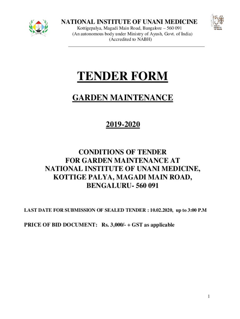 NATIONAL INSTITUTE OF UN ANI MEDICINE Kottigepalya, Malawi Main Road, Bangalore 560 091 (An autonomous body under Ministry of Ayush, Govt. of India) (Accredited to NASH) TENDER FORM GARDEN MAINTENANCE