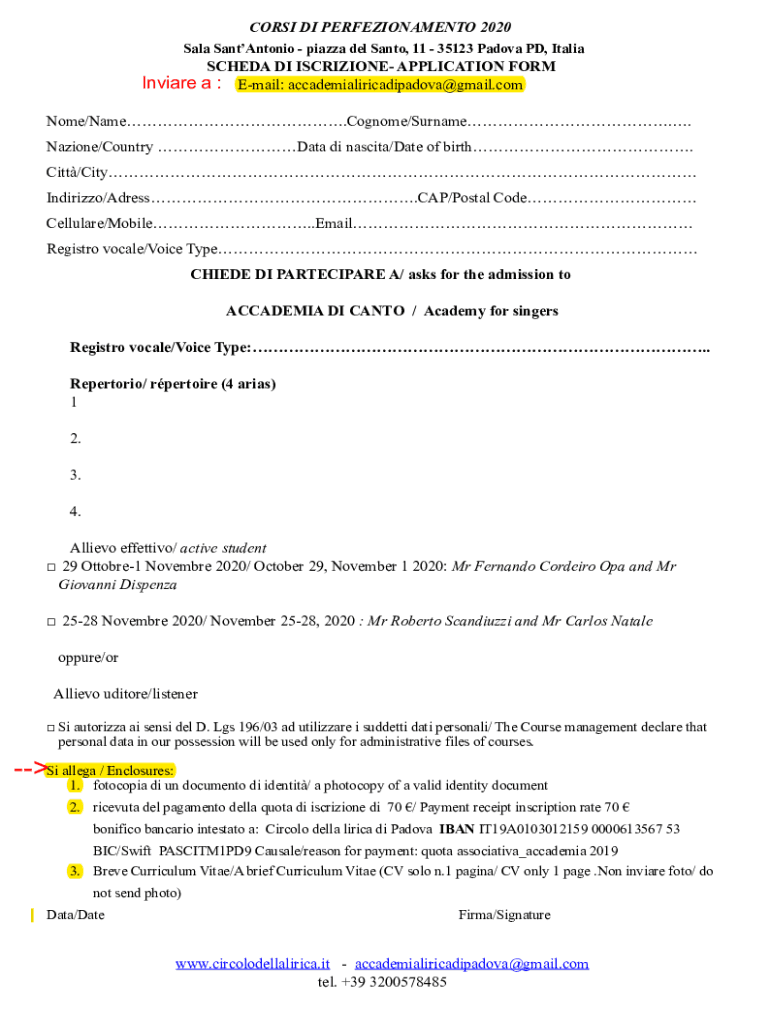 CORGI DI PERFEZIONAMENTO 2020 Sale SantAntonio piazza Del Santa, 11 35123 Pad ova PD, ItaliaSCHEDA DI ISCRIZIONE APPLICATION FORM India a : Email: accademialiricadipadova gmail.com Nome/Name. Cognomen/Surname.
