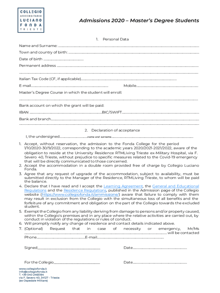 Admissions 2020 Master’s Degree Students1. Personal Database and Surname: ... Town and country of birth: ..... Date of birth .........................