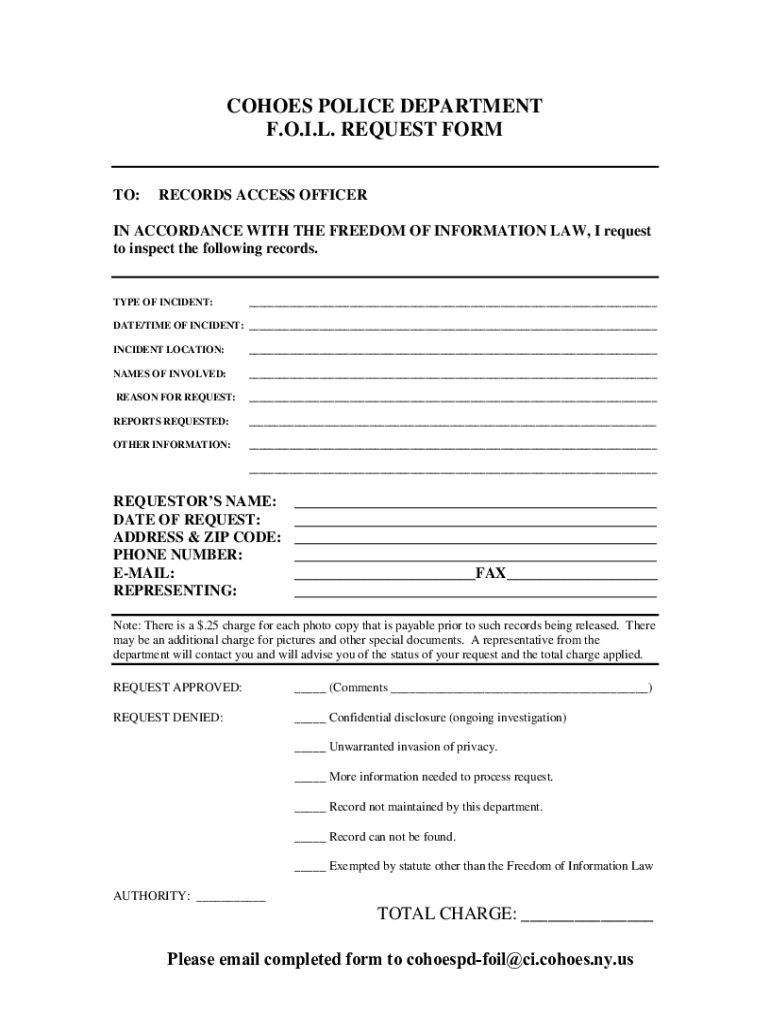 COHOS POLICE DEPARTMENT F.O.I.L. REQUEST FORM TO:RECORDS ACCESS OFFICER IN ACCORDANCE WITH THE FREEDOM OF INFORMATION LAW, I request to inspect the following records. TYPE OF INCIDENT: DATE/TIME OF