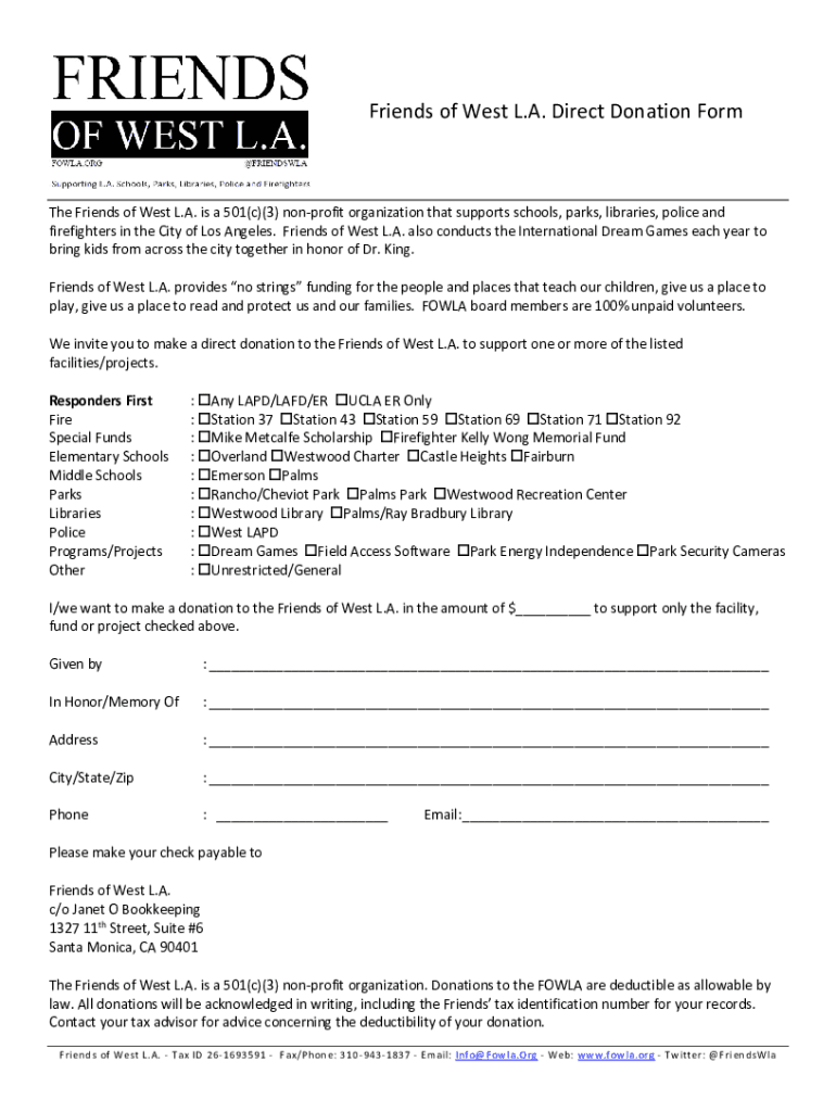 FriendsofWestL. A. DirectDonationForm TheFriendsofWestL. A.isa501(c)(3)nonprofitorganizationthatsupportsschools, parks, libraries, police and firefightersintheCityofLosAngeles. FriendsofWestL. A.alsoconductstheInternationalDreamGameseachyearto