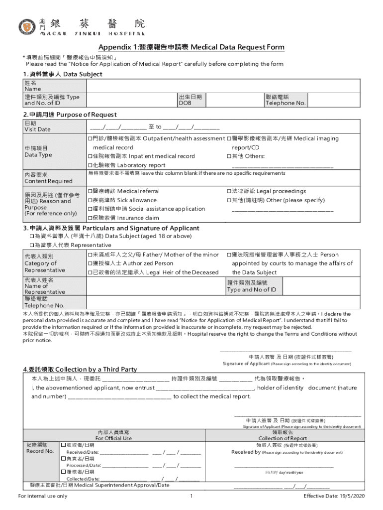 Appendix 1: Medical Data Request Form * Please read the Notice for Application of Medical Report carefully before completing the form1. Data Subject Name Type and No. of ID DOB Telephone No.2. Purpose