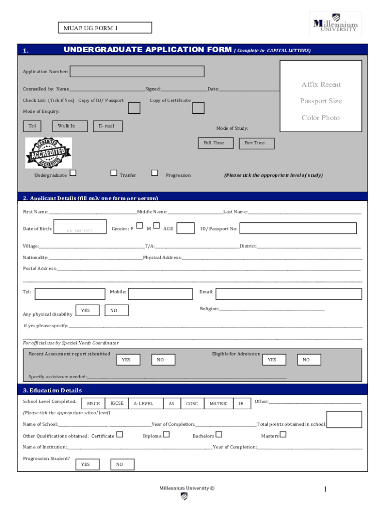 MAP UG FORM 1UNDERGRADUATE APPLICATION FORM (Complete capital LETTERS)1. Application Number: Counselled by: Name Signed: Date: Check List: (Tick if Yes) Copy of ID/ PassportPassport Recopy of Certificated