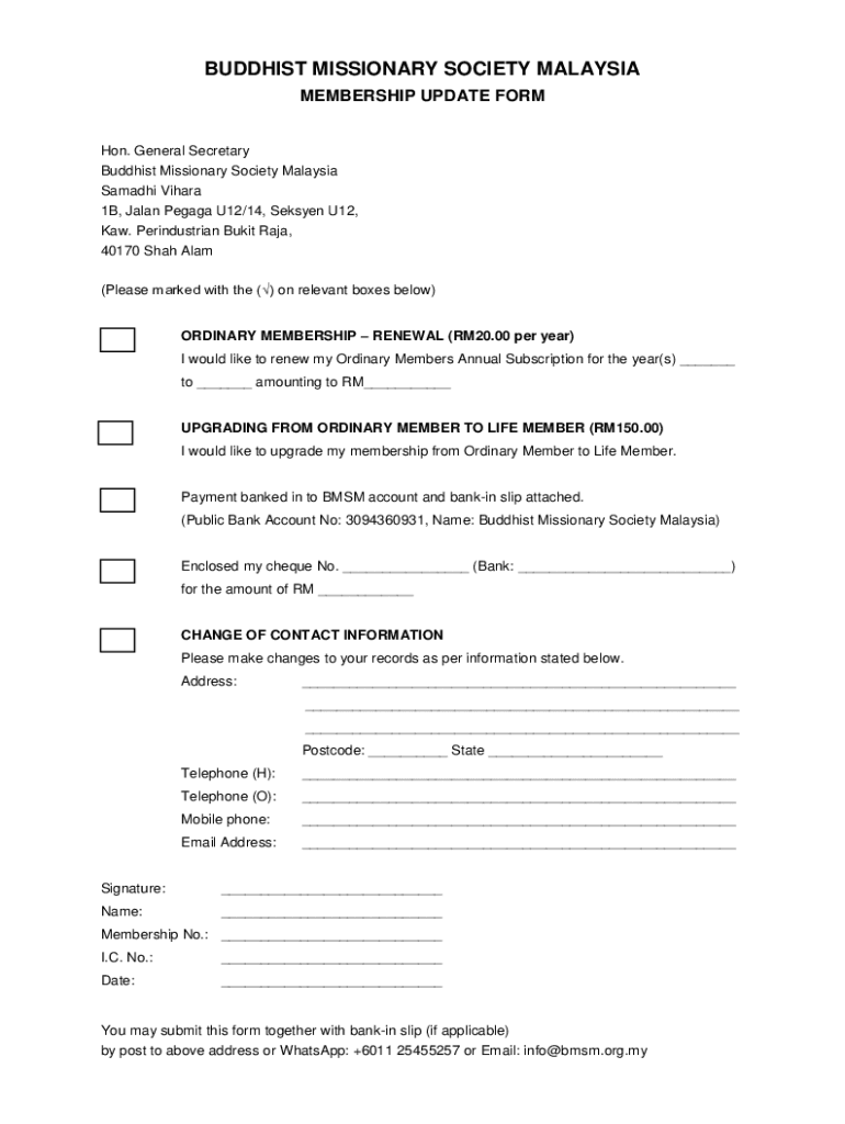 BUDDHIST MISSIONARY SOCIETY MALAYSIA MEMBERSHIP UPDATE FORM Hon. General Secretary Buddhist Missionary Society Malaysia Sarah Vicar 1B, Japan Peggy U12/14, Season U12, Law. Preindustrial By kit Raja,