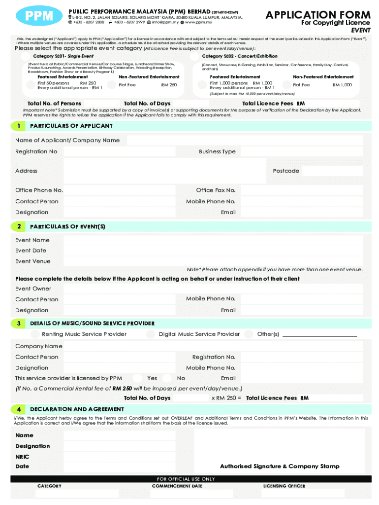 PUBLIC PERFORMANCE MALAYSIA (PPM) BROAD (201601042369) L82, NO. 2, JAPAN POLARIS, POLARIS MONT KIARA, 50480 KUALA LUMPUR, MALAYSIA. +603 6207 2888 +603 6207 2999 info ppm.my www.ppm.myAPPLICATION