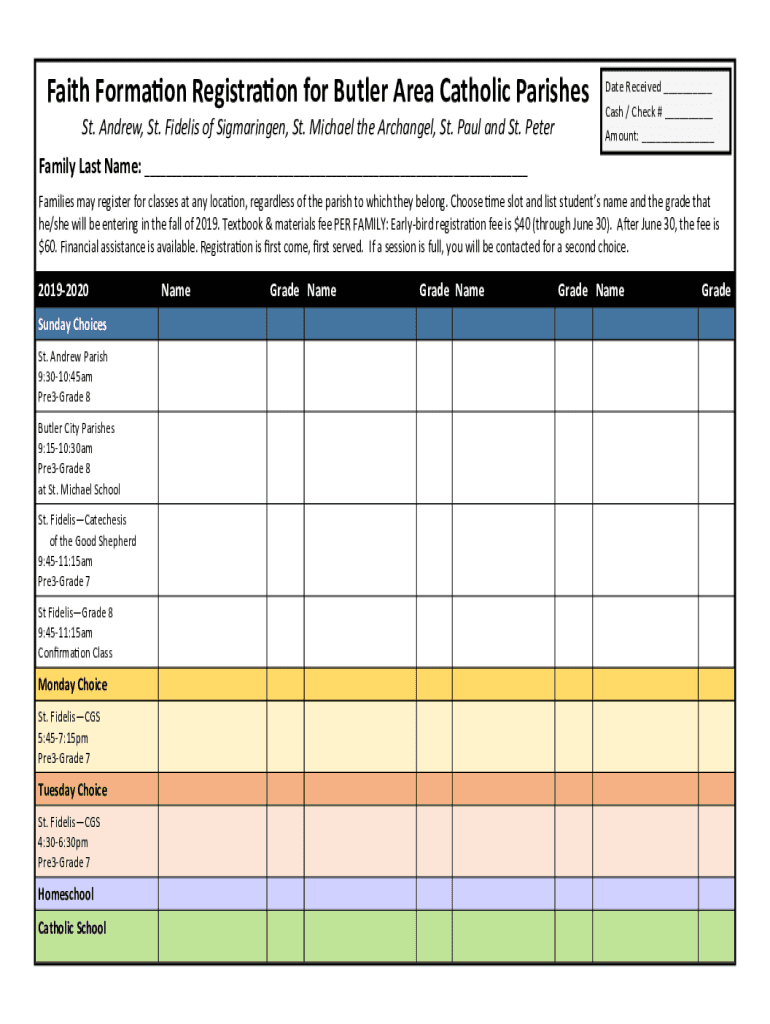 Faith Formation Registration for Butler Area Catholic Parishes St. Andrew, St. Fidel is of Sigmaringen, St. Michael the Archangel, St. Paul and St. Alternate Received Cash / Check # Amount: Family