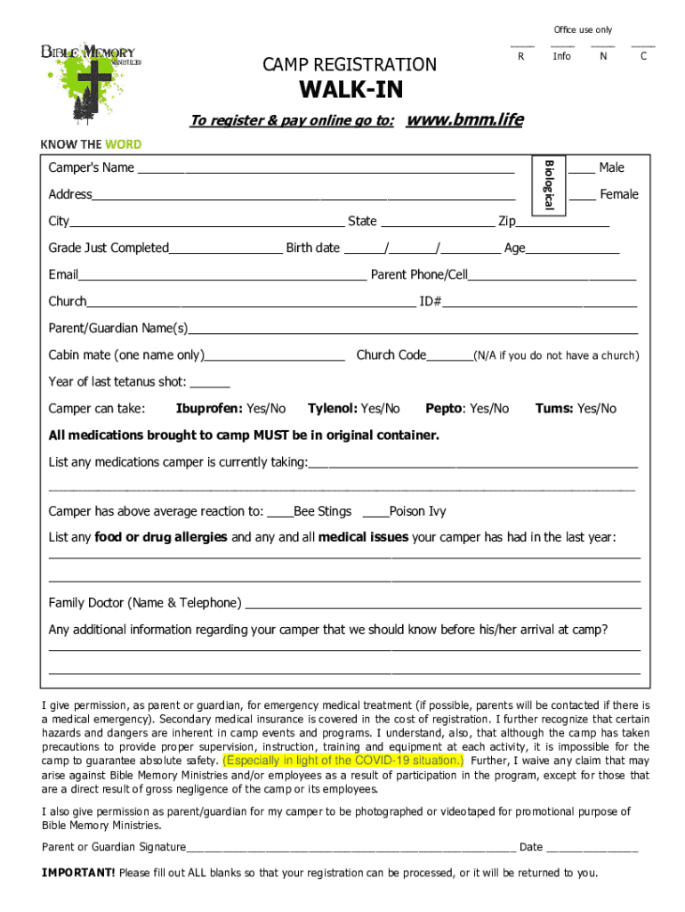 Get the free 2020 camper registration & health Walk-in form