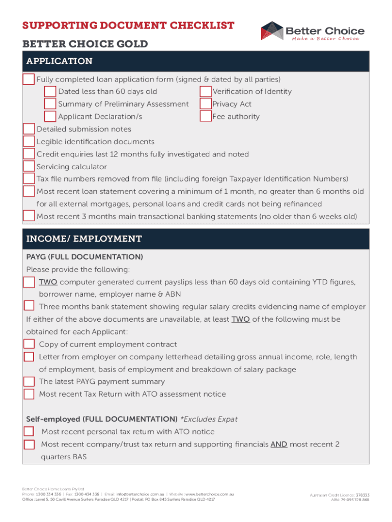 SUPPORTING DOCUMENT CHECKLIST Make a Better ChoiceBETTER CHOICE GOLD APPLICATION Fully completed loan application form (signed & dated by all parties) Dated less than 60 days verification of IdentitySummary