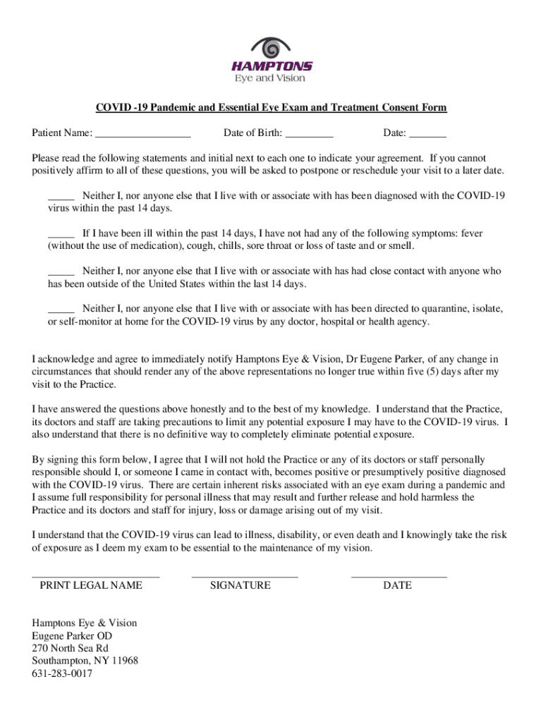 COVID-19 Pandemic and Essential Eye Exam and Treatment Consent Form Patient Name: Date of Birth: Date: Please read the following statements and initial next to each one to indicate your agreement.