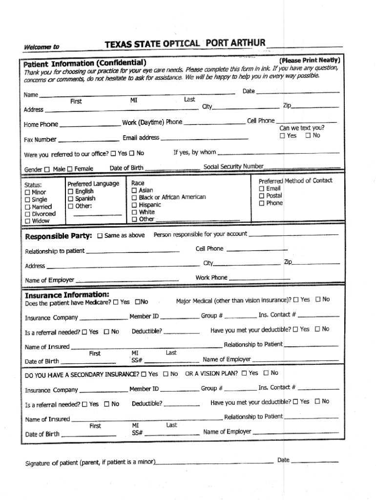 Patients who receive eye care services at Texas State Optical are required to fill out the Texas State Optical patient form.