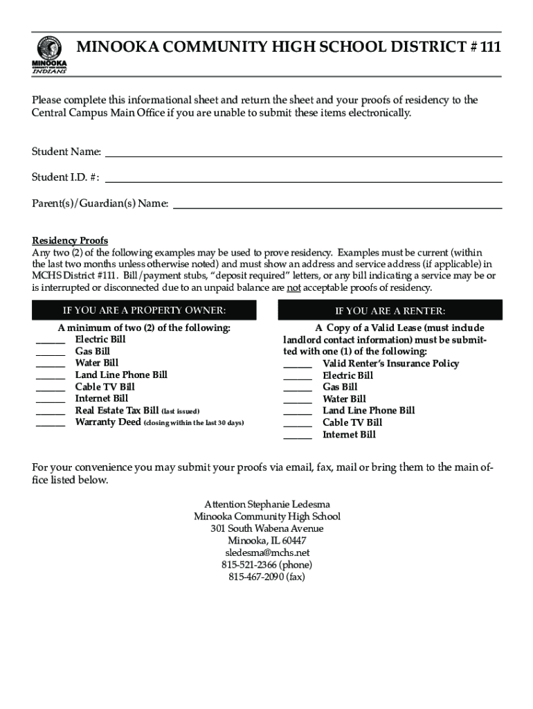 MINOLTA COMMUNITY HIGH SCHOOL DISTRICT #111 Please complete this informational sheet and return the sheet and your proofs of residency to the Central Campus Main Office if you are unable to submit