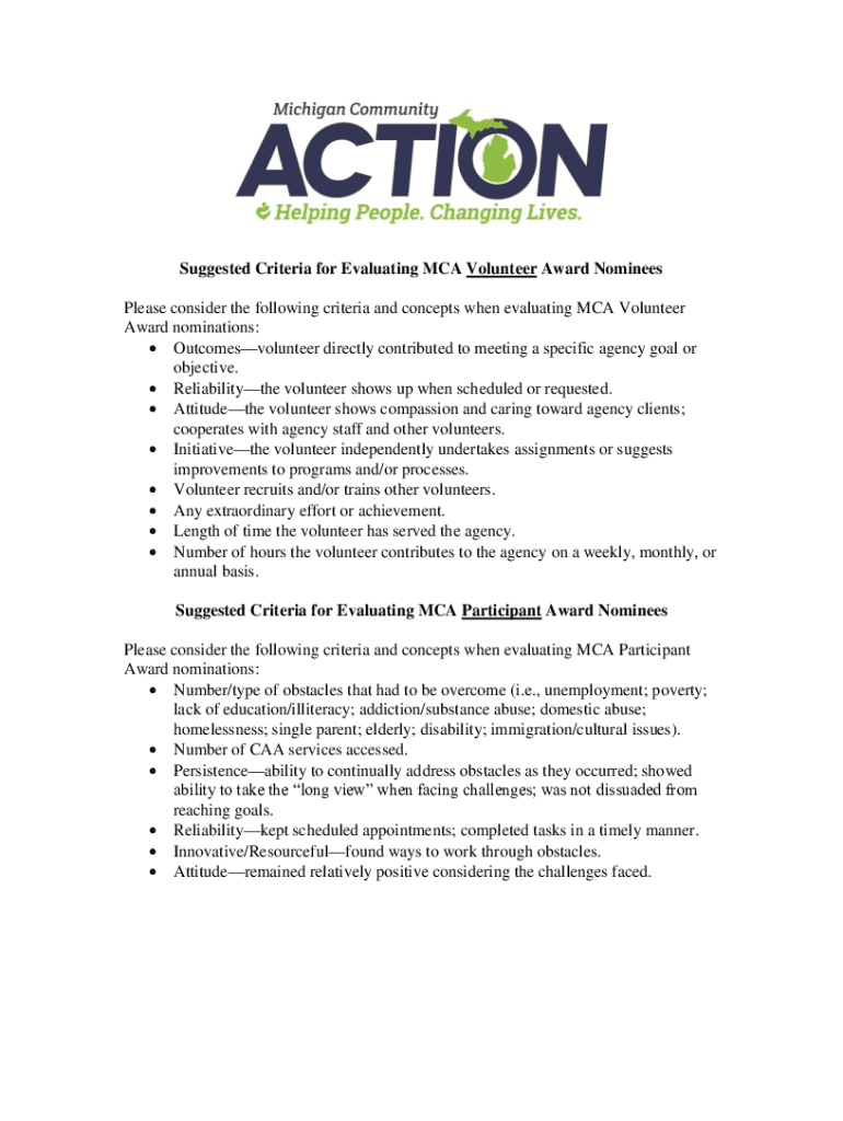 Suggested Criteria for Evaluating MCA Volunteer Award Nominees Please consider the following criteria and concepts when evaluating MCA Volunteer Award nominations: Outcomes volunteer directly contributed