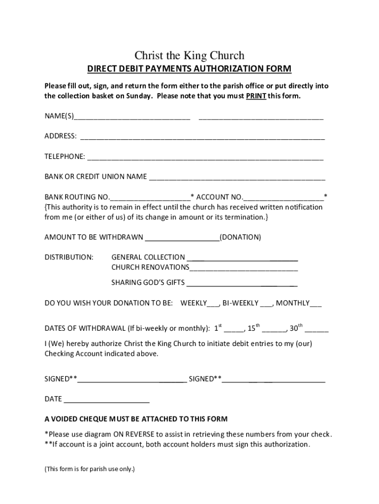 Christ the King Church DIRECT DEBIT PAYMENTS AUTHORIZATION FORM Please fill out, sign, and return the form either to the parish office or put directly into the collection basket on Sunday. Please