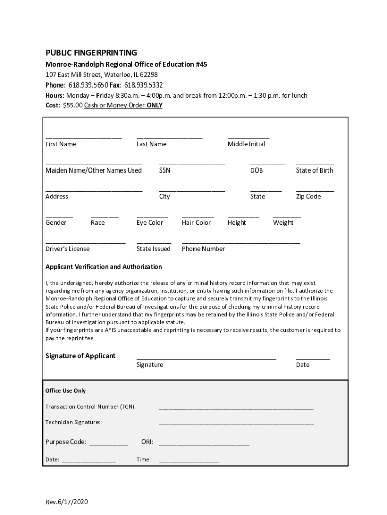 PUBLIC FINGERPRINTING Monroe Randolph Regional Office of Education #45 107 East Mill Street, Waterloo, IL 62298 Phone: 618.939.5650 Fax: 618.939.5332 Hours: Monday Friday 8:30a.m. 4:00p.m. and break