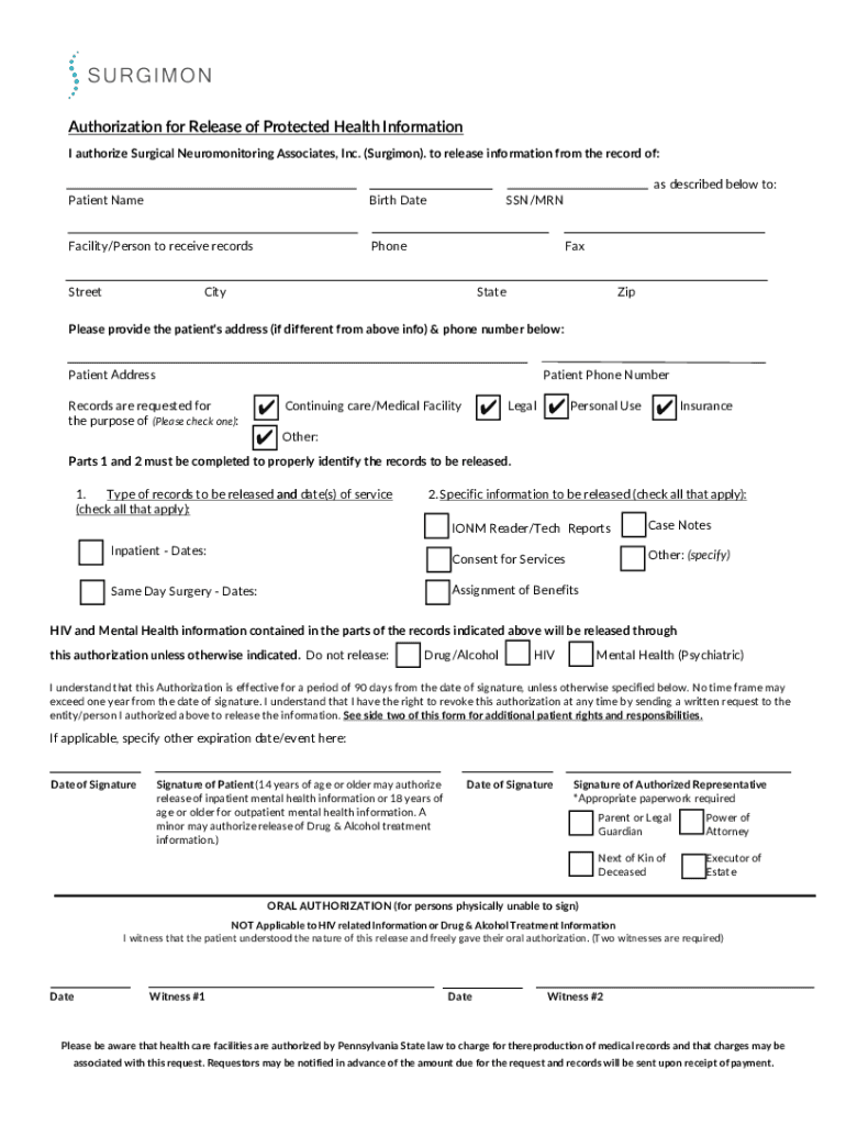 Authorization for Release of Protected Health Information I authorize Surgical Neuromonitoring Associates, Inc. (Surgeon). To release information from the record of: Patient Rebirth DateFacility/Person