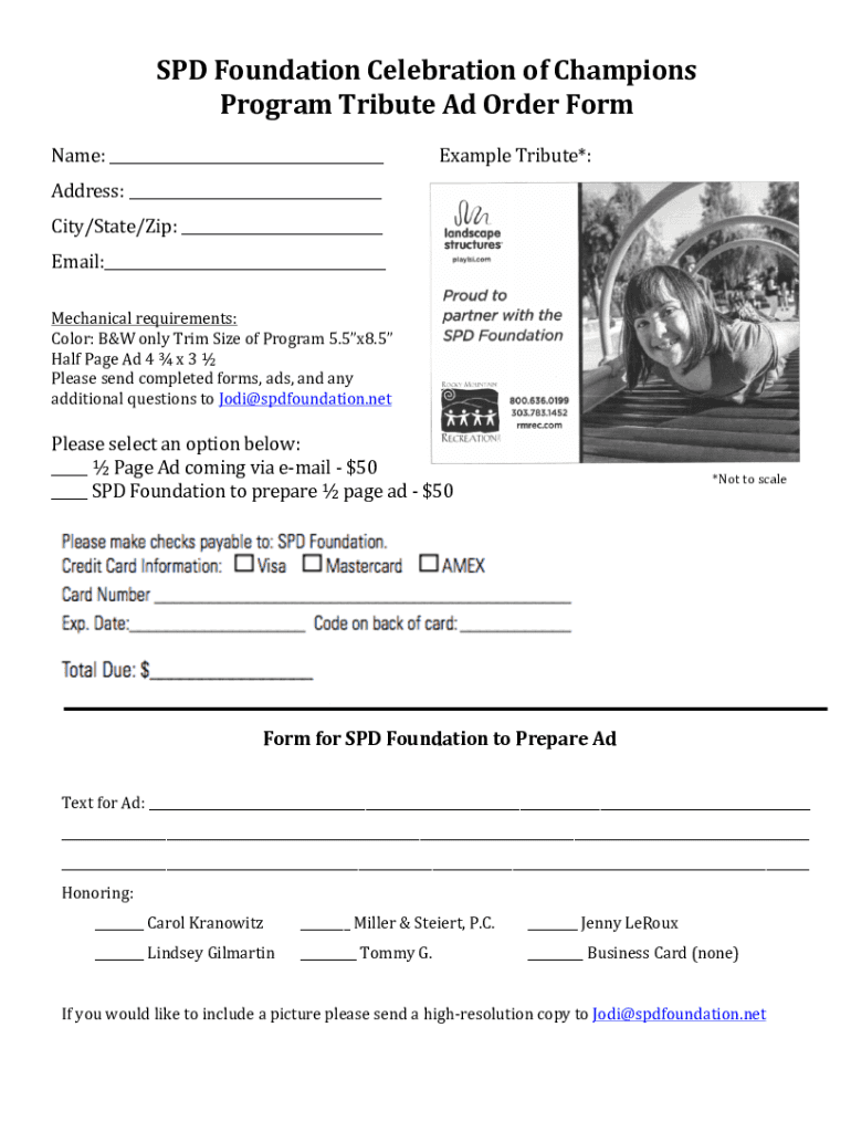 SPDFoundationCelebrationofChampions ProgramTributeAdOrderForm Name: ExampleTribute*: Address: City/State/Zip: Email: Mechanical requirements: Color:B&WonlyTrimSizeofProgram5.5×8.5 HalfPageAd4x3 Please