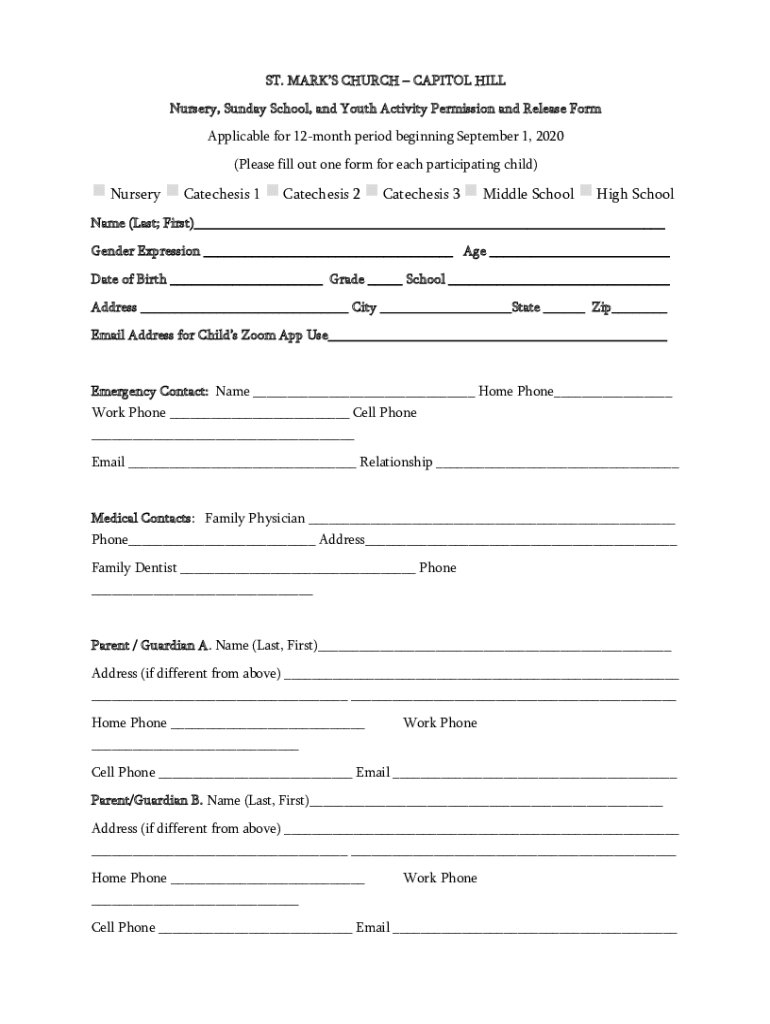 ST. MARKS CHURCH CAPITOL HILL Nursery, Sunday School, and Youth Activity Permission and Release Formalizable for 12month period beginning September 1, 2020 (Please fill out one form for each participating
