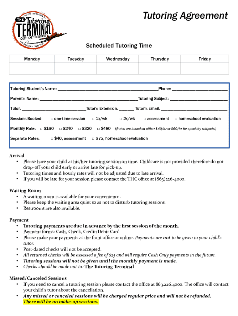 Tutoring Agreement Scheduled Tutoring Time MondayTuesdayWednesdayThursdayFridayTutoring Student's Name: Phone: Parent's Name: Tutoring Subject: Tutor: Tutor's Extension: Tutor's Email: Sessions Booked: