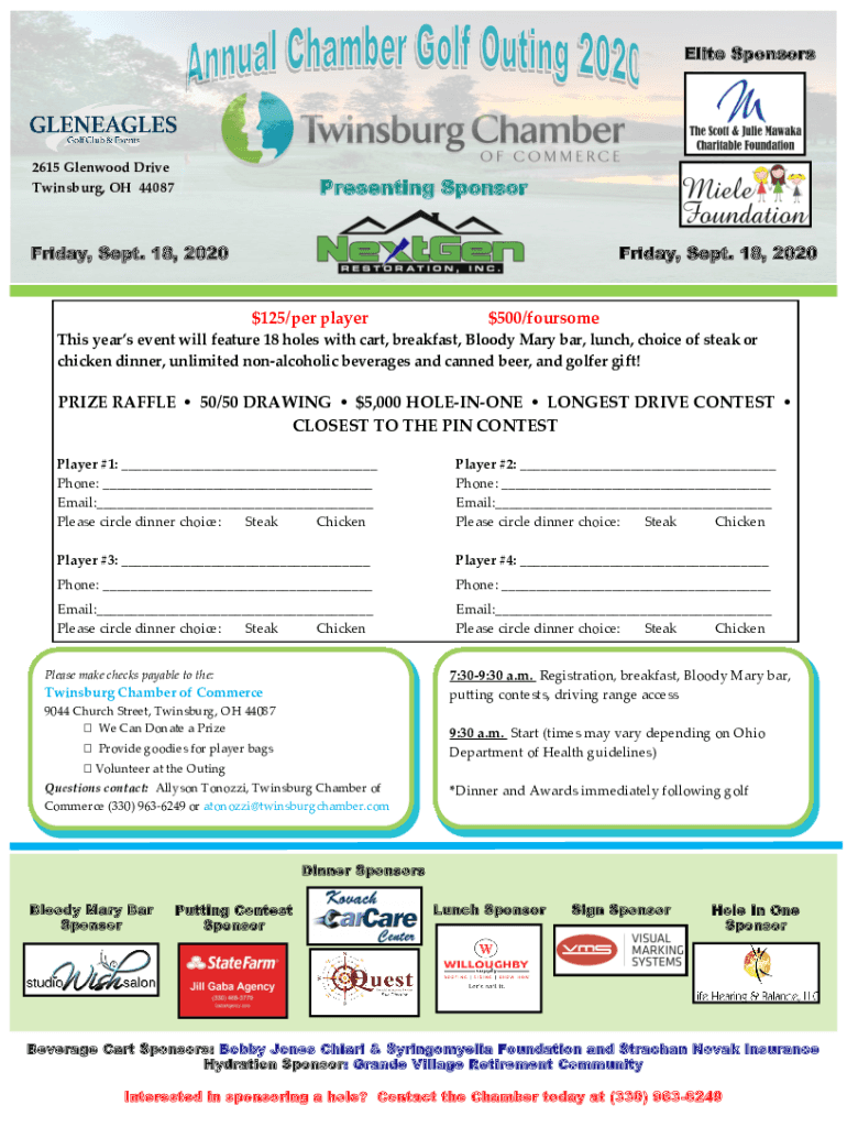 Elite Sponsors2615 Glenwood Drive Twins burg, OH 44087Presenting Sponsor Friday, Sept. 18, 2020Friday, Sept. 18, $2020125/per player$500/foursomes years event will feature 18 holes with cart, breakfast,