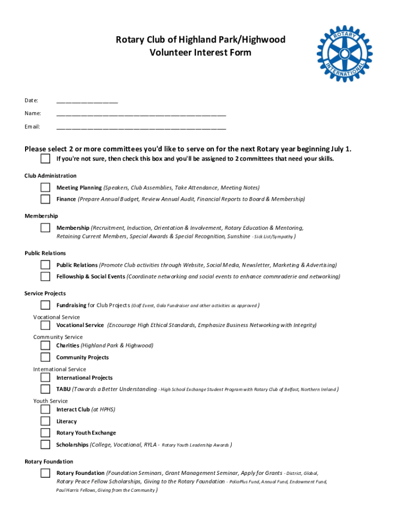 Rotary Club of Highland Park/High wood Volunteer Interest Format: Name: Email: Please select 2 or more committees you'd like to serve on for the next Rotary year beginning July 1. If you're not sure,