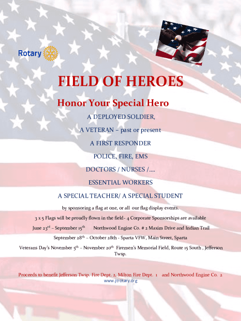 FIELD OF HEROES Honor Your Special Hero A DEPLOYED SOLDIER, A VETERAN past or present A FIRST RESPONDER POLICE, FIRE, EMS DOCTORS / NURSES /. ESSENTIAL WORKERS A SPECIAL TEACHER/ A SPECIAL STUDENT