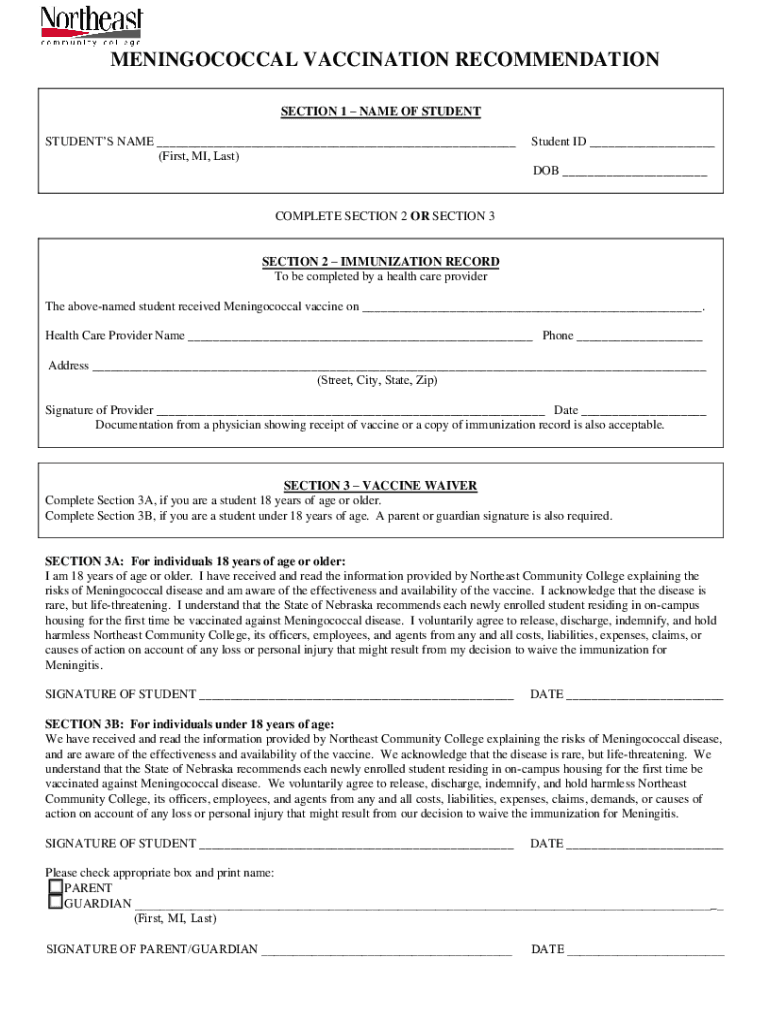 PRINTRESETMENINGOCOCCAL VACCINATION RECOMMENDATION SECTION 1 NAME OF STUDENT STUDENTS NAME (First, MI, Last)Student ID DOB COMPLETE SECTION 2 OR SECTION 3, SECTION 2 IMMUNIZATION RECORD To be completed