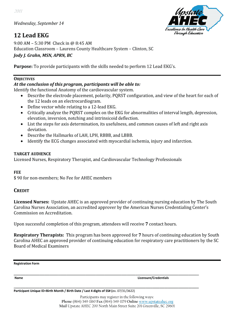 2011 Wednesday, September 14 12 Lead EKG 9:00 AM 5:30 PM Check in 8:45 AM Education Classroom Laurens County Healthcare System Clinton, SC Jody J. Grain, MSN, APRN, BC Purpose: To provide participants