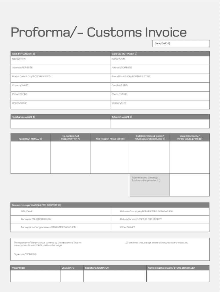 Proforma/ Customs Invoice Date/DATA 1)Sent by/ SENDER 2)Sent to/ COTTAGER 3)Name/Nickname/NAVNAddress/ADRESSEAddress/ADRESSEPostal Code & City/POSTER & STEDPostal Code & City/POSTER & STEDCountry/Backcountry/Sandstone/TLF.NRPhone/TLF.NROrg.nr/VAT.nrOrg.nr/VAT.nrTotal