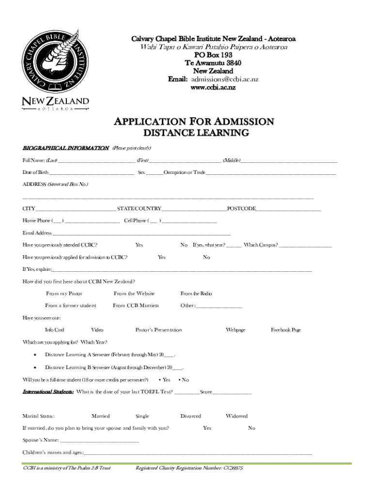 Calvary Chapel Bible Institute New Zealand AotearoaWahi Tape o Award Ontario Paper o Altered PO Box 193 Te Await 3840 New Zealand Email: admissions CBI.ac.NZ www.ccbi.ac.nzAPPLICATION FOR ADMISSION