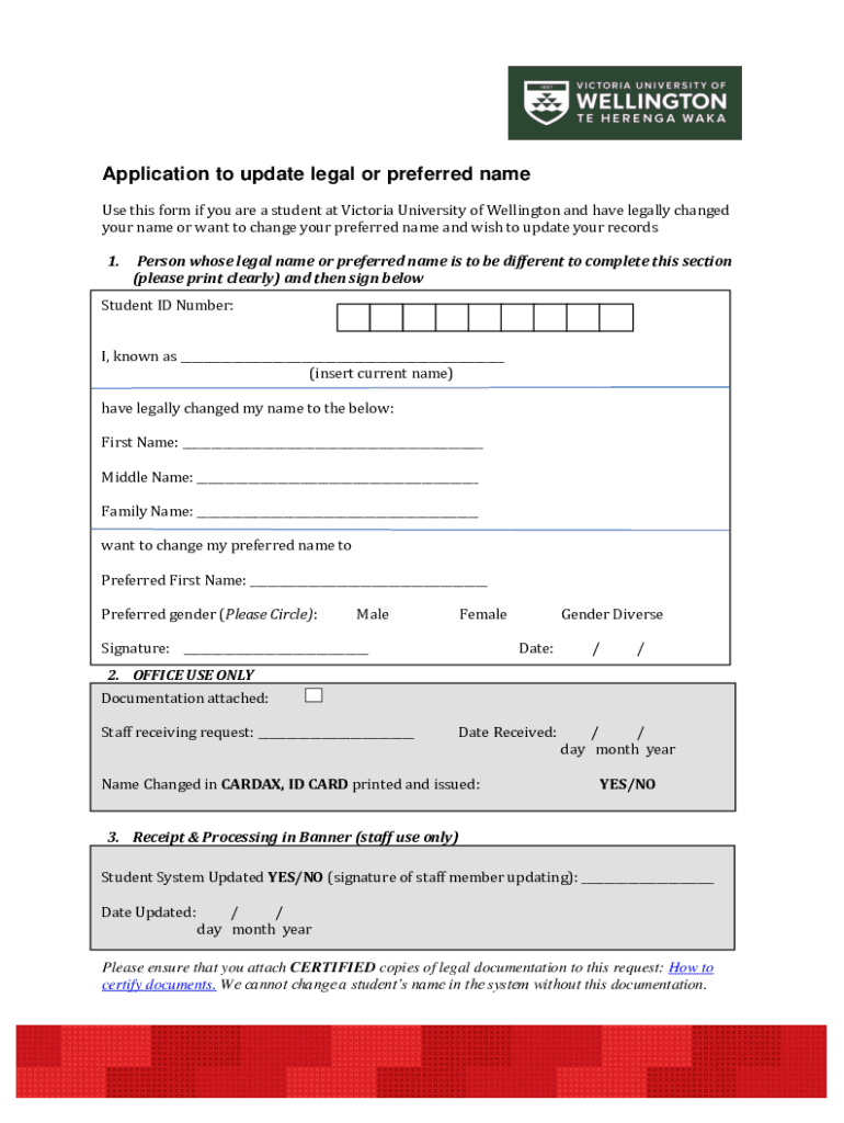 Application to update legal or preferred name Use this form if you are a student at Victoria University of Wellington and have legally changed your name or want to change your preferred name and wish