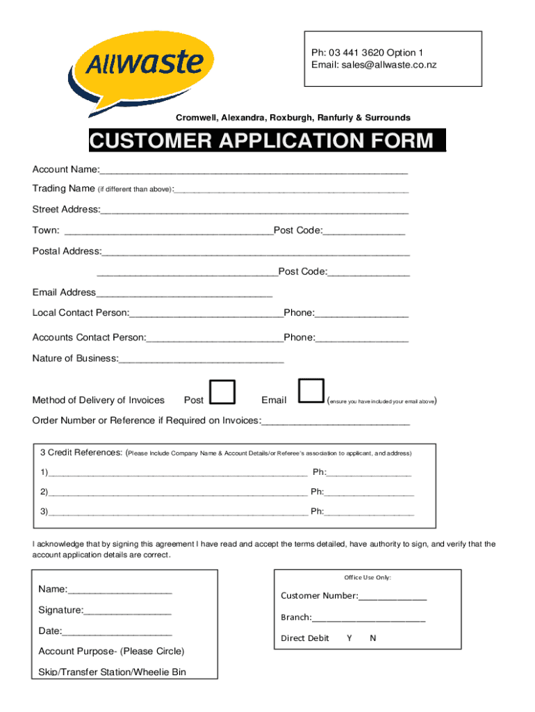 PH: 03 441 3620 Option 1 Email: sales all waste.co. Cromwell, Alexandra, Rexburg, Manfully & SurroundsCUSTOMER APPLICATION FORM Account Name: Trading Name (if different from above): Street Address:
