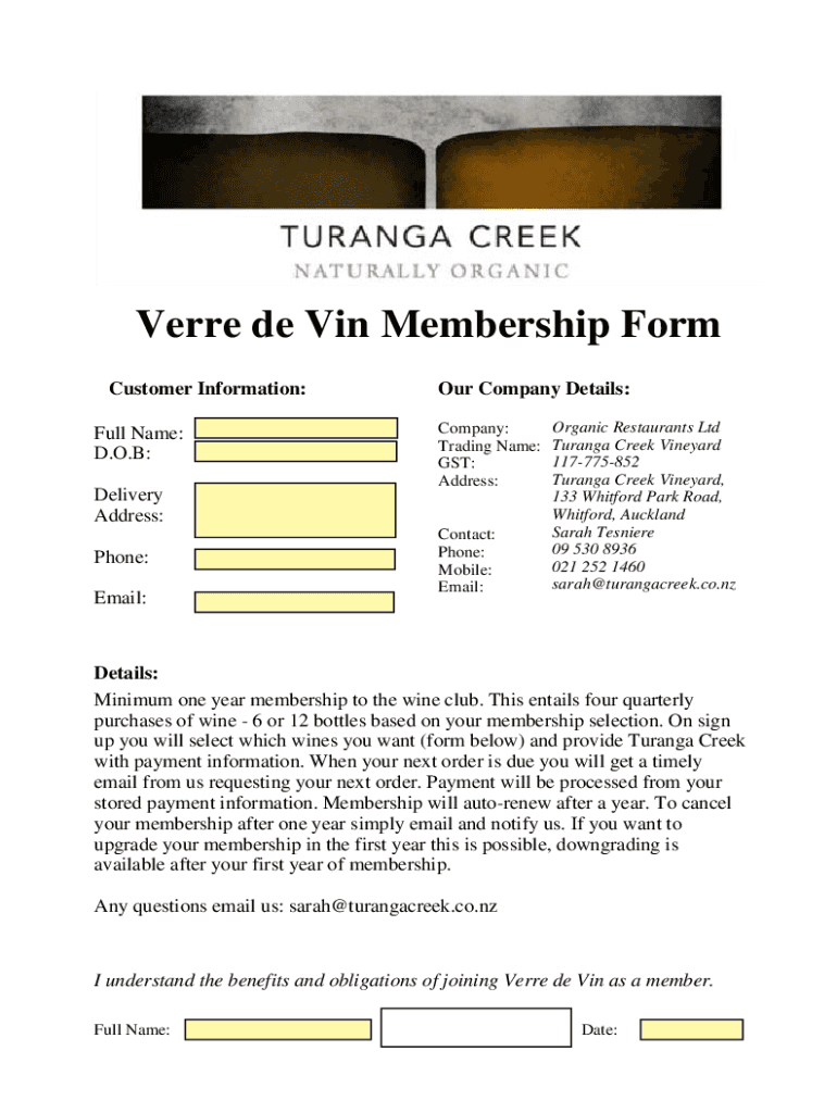 Verse de Vin Membership Form Customer Information: Full Name: D.O.B: Delivery Address: Phone: Email:Our Company Details: Company: Trading Name: GST: Address: Contact: Phone: Mobile: Email:Organic