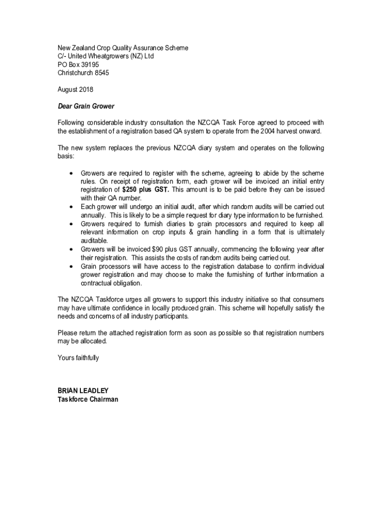 New Zealand Crop Quality Assurance Scheme C/ United Wheat growers (NZ) Ltd PO Box 39195 Christchurch 8545 August 2018 Dear Grain Grower Following considerable industry consultation the NZ CQA Task