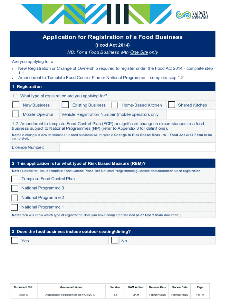Application for Registration of a Food Business (Food Act 2014) NB: For a Food Business with One Site only Are you applying for a: New Registration or Change of Ownership required to register under