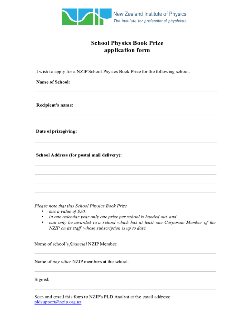 Students who wish to be considered for the nzip school physics prize must fill out the necessary application form.
