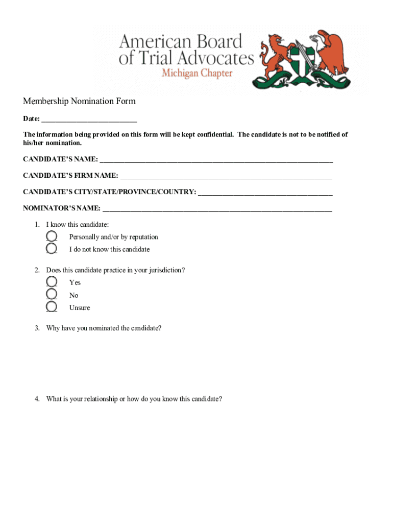 Membership Nomination Form Date: The information being provided on this form will be kept confidential. The candidate is not to be notified of his/her nomination. CANDIDATES NAME: CANDIDATES FIRM