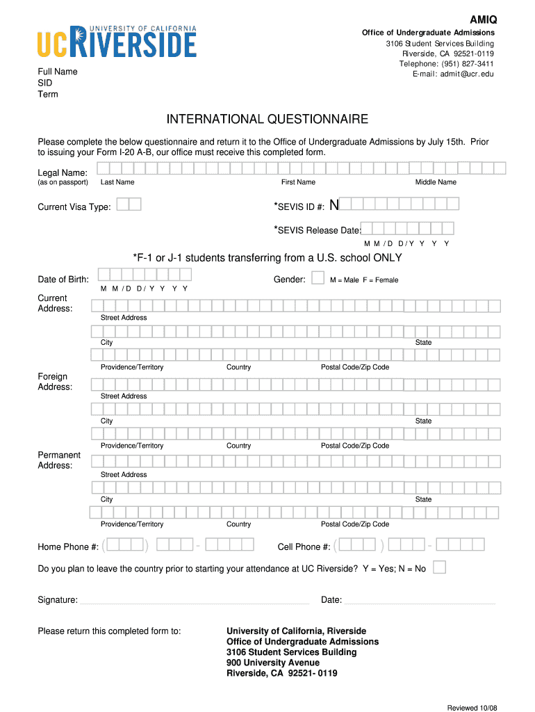 The International Student Questionnaire is a crucial component of the admission process for international students applying to UC Riverside. Specifically tailored for these applicants, this form plays a vital role in acquiring the necessary information for their admission. Timely and precise completion is essential for the issuance of Form I-20 A-B, which is paramount for visa processing and study in the U.S.