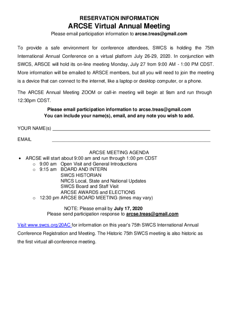 RESERVATION INFORMATIONARCSE Virtual Annual Meeting Please email participation information to arose.treas gmail.com To provide a safe environment for conference attendees, SACS is holding the 75th