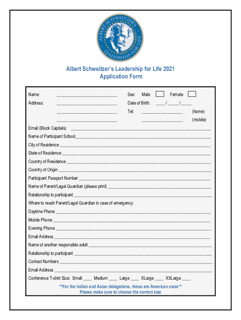 Albert Schweitzer's Leadership for Life 2021 Application Form Name: Sex:Address: Date of Birth: Tel: MaleFemale / / (home) (mobile)Email (Block Capitals) Name of Participant School City of Residence
